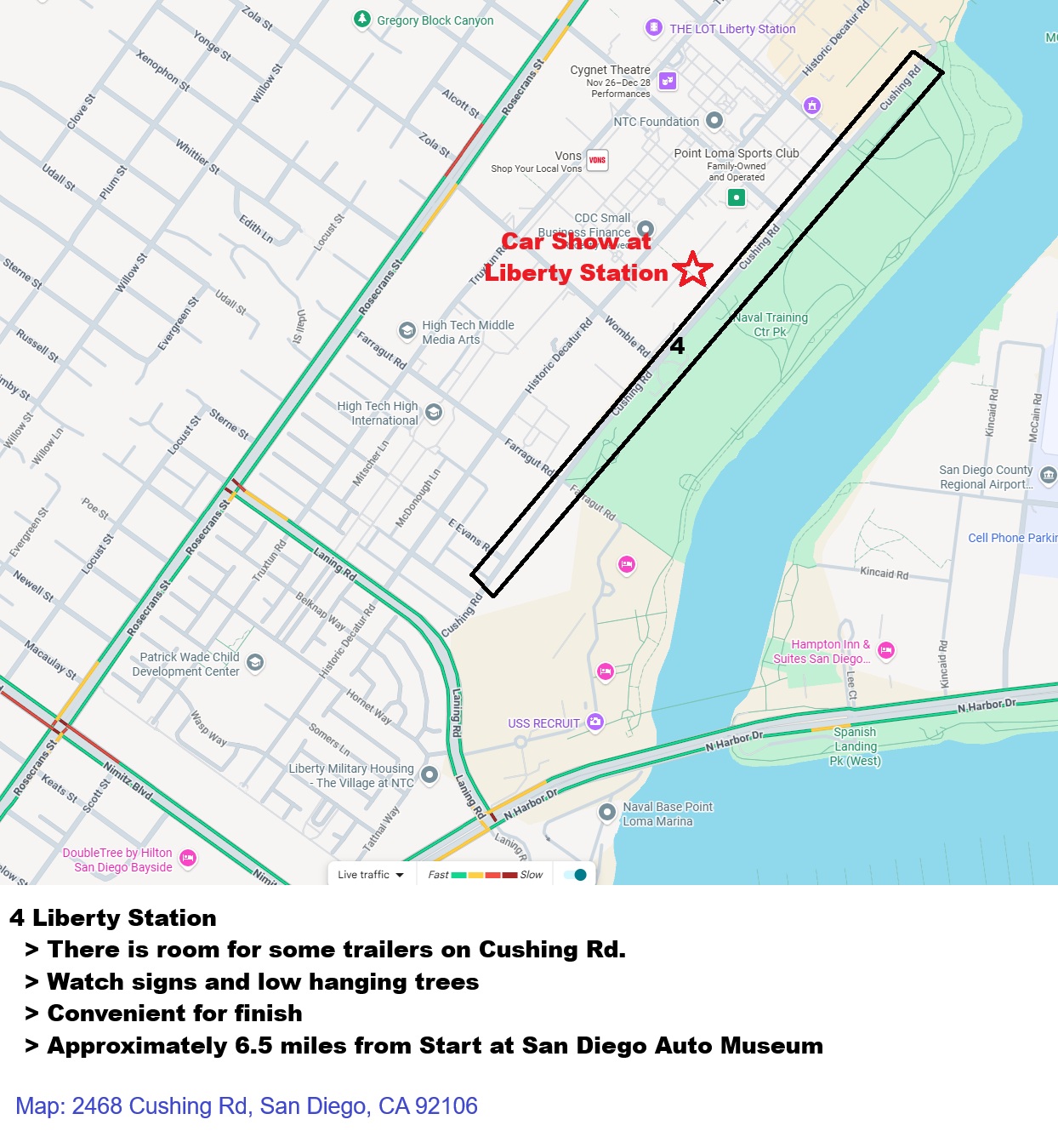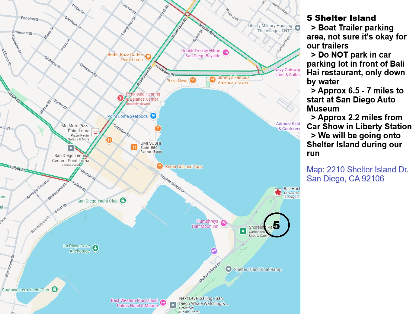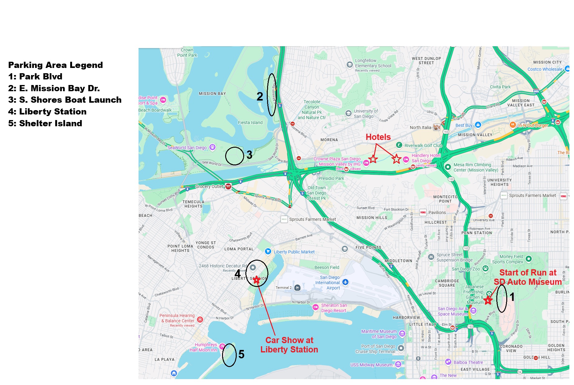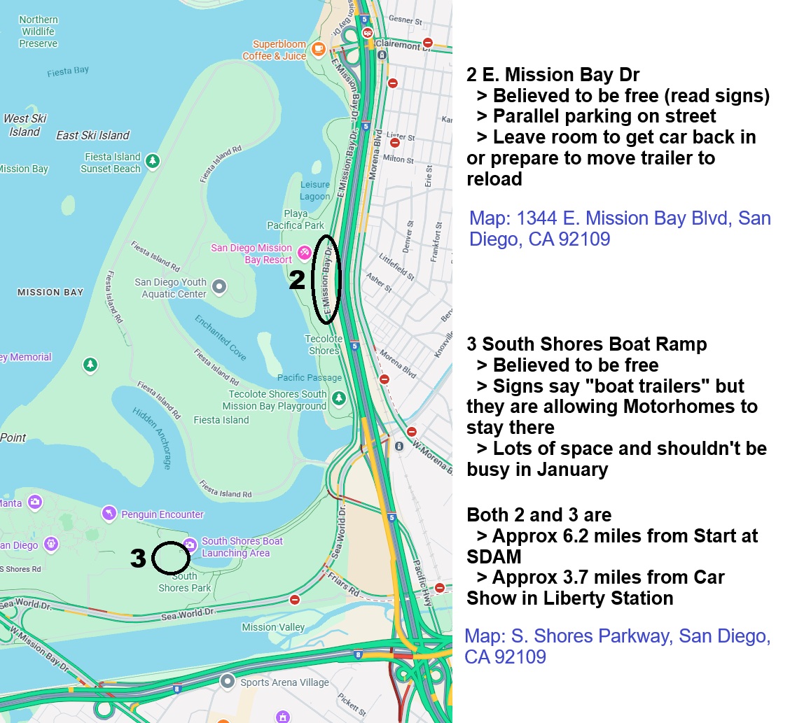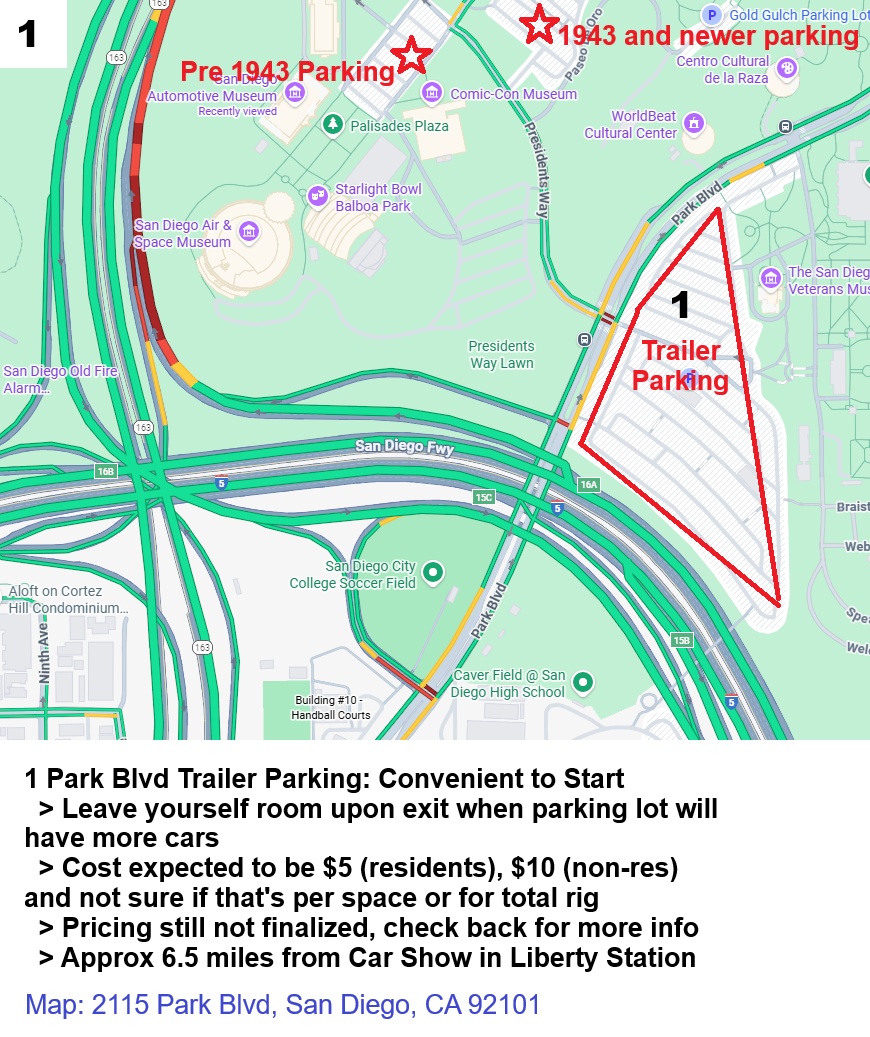 Last year many of us parked our trucks and trailers across Park Blvd from the start (San Diego Auto Museum) in an area designated #1 on the below map. They will now charge for parking in that area. We have provided some areas which appear to be free on first map below around Mission Bay, Liberty Station, and Shelter Island. As time gets closer we can provide suggested routes from these parking locations to the start of the Excursion in front of the San Diego Auto Museum.